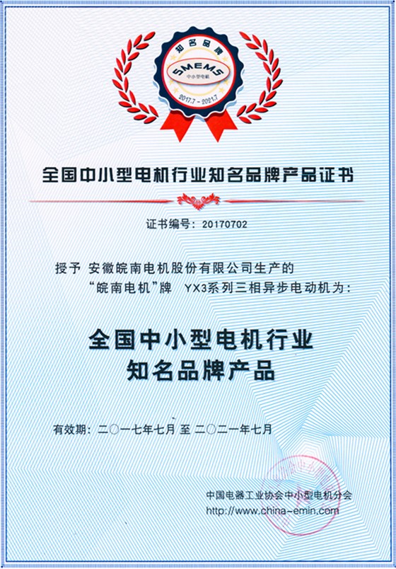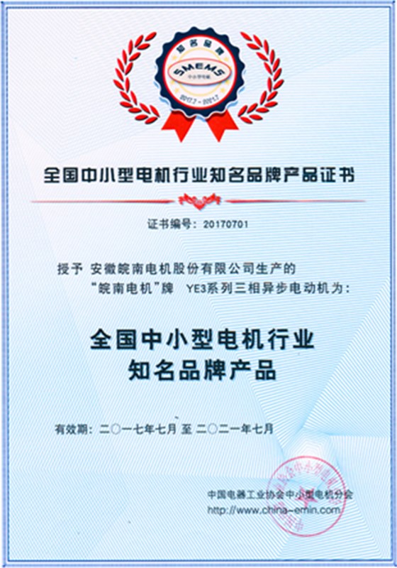 皖南電機榮獲 “全國中小型電機行業(yè)知名品牌產(chǎn)品”稱號